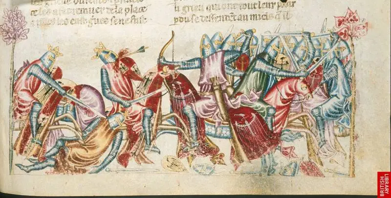 Изображение подобных конусовидных шлемов в большом количестве встречаются на миниатюрах из «Хроники Колмариенса», 1298 г. Британская библиотека, Лондон
