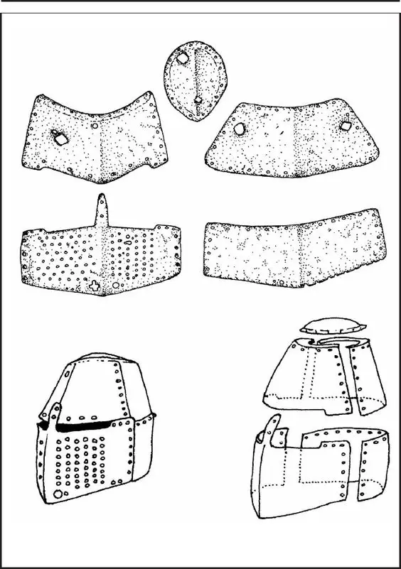 И тут около 1200 года, или даже несколько раньше, рядом с коническими шлемами появляются еще и совершенно новые и ранее неизвестные шлемы – «шлемы кастрюля» или «шлемы-таблетка». Выглядят они подобно… кухонному ковшику с отогнутой вниз рукояткой. Новый шлем оказался настоящей находкой. Во-первых, он собирался всего из двух деталей – тульи и донышка, соединявшихся на заклепках, то есть сделать его было очень легко. Во-вторых, хотя удары с него не соскальзывали, но и цели они не достигали, так как приходились на Г-образную кромку тульи «кастрюли», прорубить которую было сложнее, чем гладкую пластину толщиной 1,5 мм. Затем к нему добавили лицевую маску и… нашлемные украшения в виде флажков, поднятых кверху ладоней и когтистых орлиных лап.