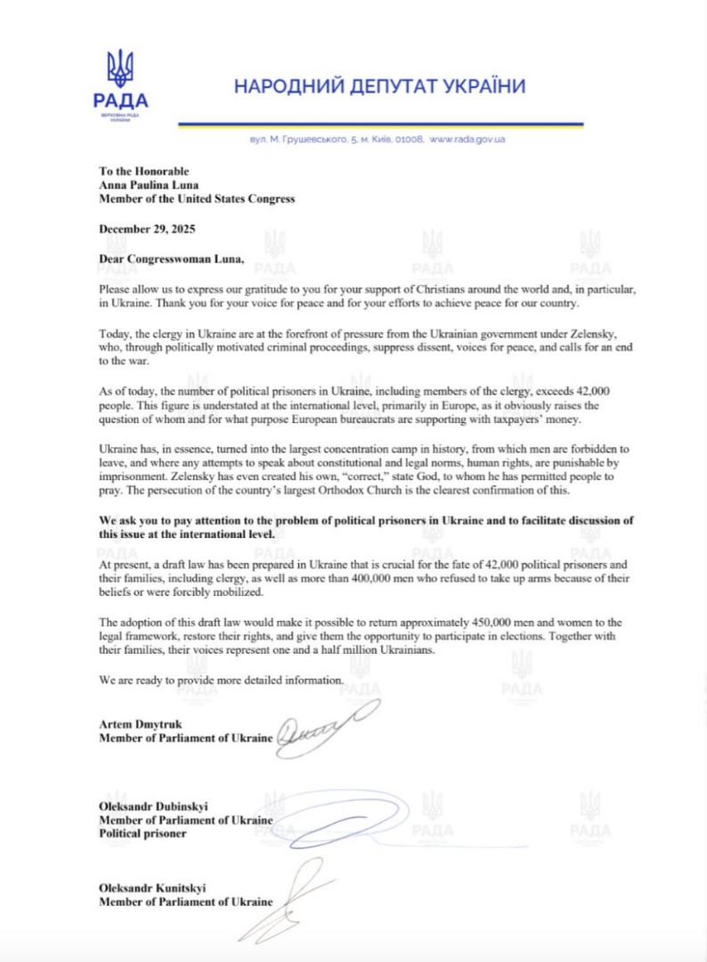 «Наше письмо о судьбах украинских политзаключенных дошло до конгрессвумен Анна Паулина Луна, которая теперь будет поднимать вопрос о политзаключенных в Госдепе США», - сообщил после этого один из авторов обращения Александр Дубинский.