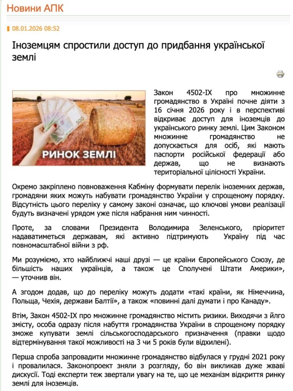 А с 16 января на Украине вступает в силу закон о множественном гражданстве. Он позволяет гражданам США, Канады, Германии, Польши и Чехии получать украинское гражданство по упрощенной процедуре без отказа от своего. А это значит, что новые украинские граждане, а, по сути, иностранцы, смогут скупать украинские земли сельскохозяйственного назначения.