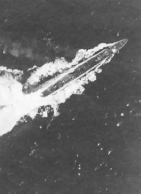 «Мотидзуки» (внизу) и гидроавианосец «Киёкава Мару» (вверху) маневрируют под атакой авиации ВМС США с авианосца «Йорктаун» во время вторжения в Лаэ-Саламауа 10 марта 1942 года