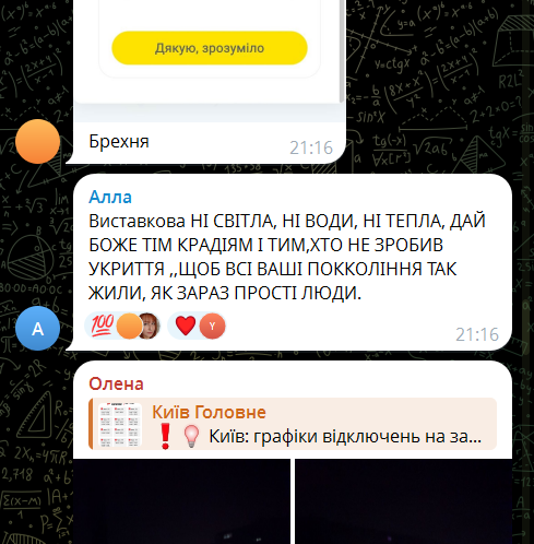В некоторых районах правого берега (в частности, Оболонь и Подол) света может не быть почти целые сутки. Аналогичная ситуация и в районе киевской Борщаговки. В то же время часть киевлян в пабликах в отчаянии пишут, что свет у них отсутствует и по 2-3 суток. Киевляне в соцсетях также публикуют видео из своих квартир, где нету света и отопления. Некоторые жители утверждают, что уже пятые сутки сидят без электричества. Люди также постят видео со снегом и обледенением в своих квартирах. Появляются в Сети и фото разорванных труб и батарей.