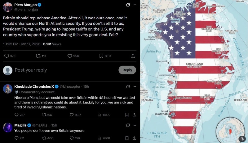 Известный английский журналист Пирс Морган иронически прокомментировал намерение главы Белого дома Дональда Трампа присоединить Гренландию, предложив Лондону «выкупить США». А также можно ввести пошлины на те страны, которые поддерживают идею сопротивления этому «выгодному соглашению» о возвращении Соединенных Штатов под британскую власть. Морган также высмеял аргумент Трампа касательно безопасности и напомнил, что Америка когда-то была частью Британской империи.