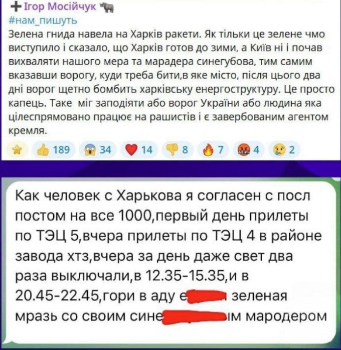 Харьковчане в чатах возлагают вину за разрушение энергоинфраструктуры на Владимира Зеленского. После его заявления о том, что «Харьков готов к зиме, а Киев — нет», последовала серия точных ударов по городским ТЭЦ. Многие видят в этом прямую связь.