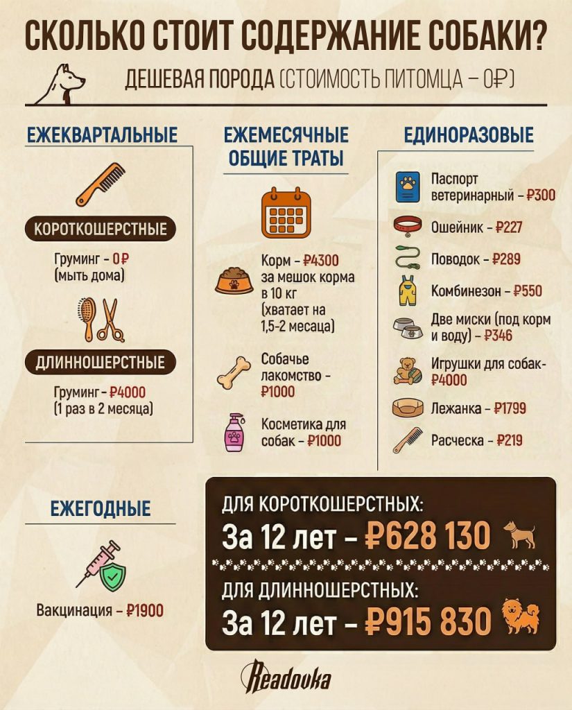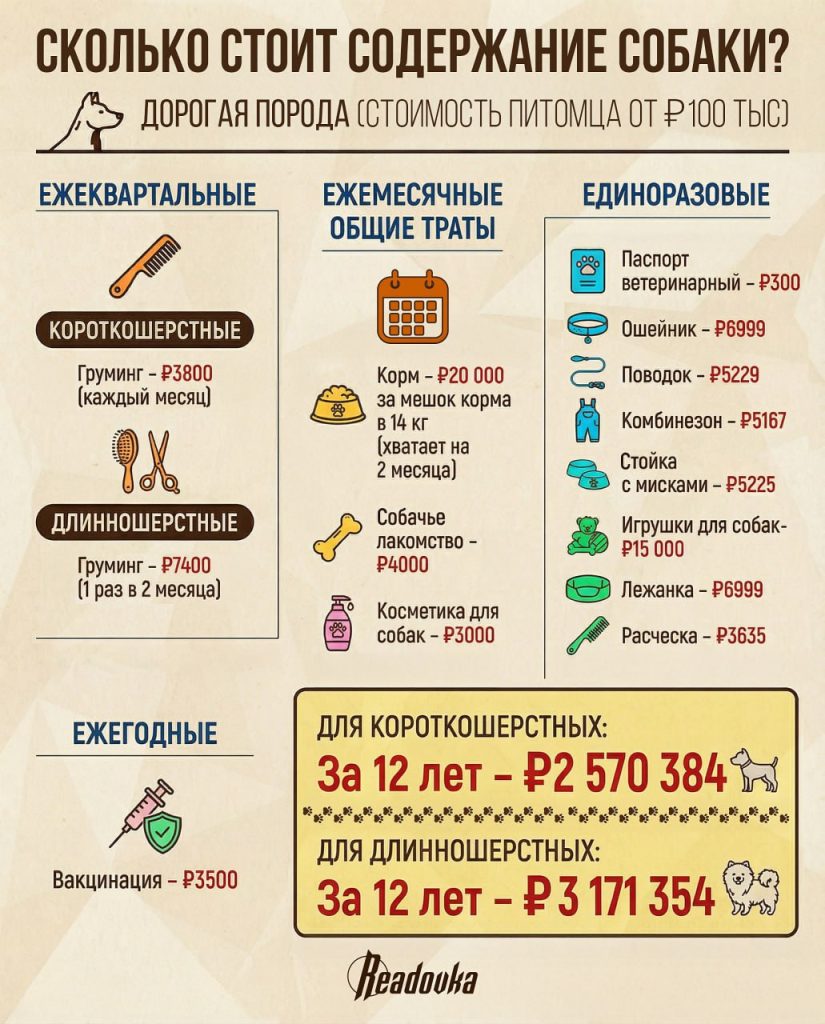 Выяснилось, что в первом случае хозяину придется тратить приблизительно 265 тыс рублей в год, в то время как во втором – около 76 тыс рублей. За среднюю жизнь собаки в 12 лет элитная порода обойдется хозяину в 3,17 млн рублей, тогда как бюджетная – в 900 тыс рублей.