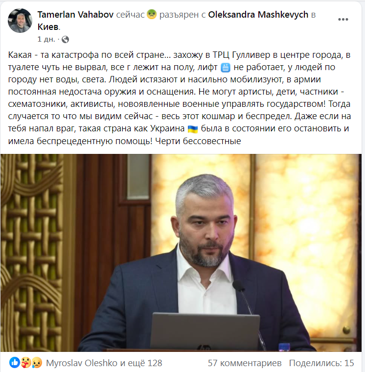 «Какая - та катастрофа по всей стране... захожу в ТРЦ Гулливер в центре города, в туалете чуть не вырвал, все г лежит на полу, лифт не работает, у людей по городу нет воды, света», - заявил Вахабов в соцсети.