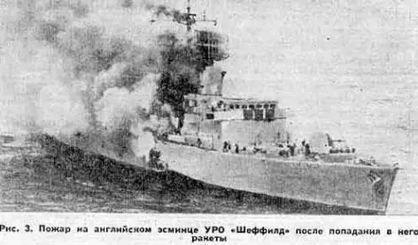 Впрочем, ни одна из «летучих рыб» ещё не была использована. Их время пришло 4 мая, через два дня после потопления АПЛ «Конкеррор» лёгкого крейсера «Генерал Бельграно». В то утро оперативная группа Королевского флота шла к Фолклендам: впереди в радиолокационном дозоре двигались новенькие эсминцы типа 42: в центре «Глазго» капитана 2 ранга Пола Ходдинотта, на правом фланге «Ковентри» капитана 2 ранга Дэвида Харт-Дайка, на левом фланге «Шеффилд» капитана 2 ранга Джеймса «Сэма» Солта. В 18 милях восточнее шли фрегаты «Эрроу», «Ярмут», «Алакрити» и эсминец «Гламорган», следом за ними вспомогательные корабли «Олмеда», «Ресурс» и «Форт Остин».
