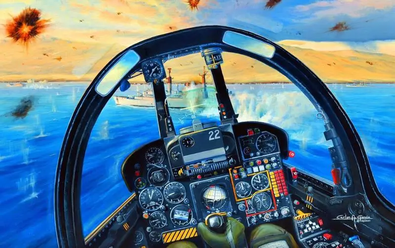 «Даггер» атакует фрегат «Бриллиант» из 30-мм пушки, картина художника Карлоса А. Гарсиа