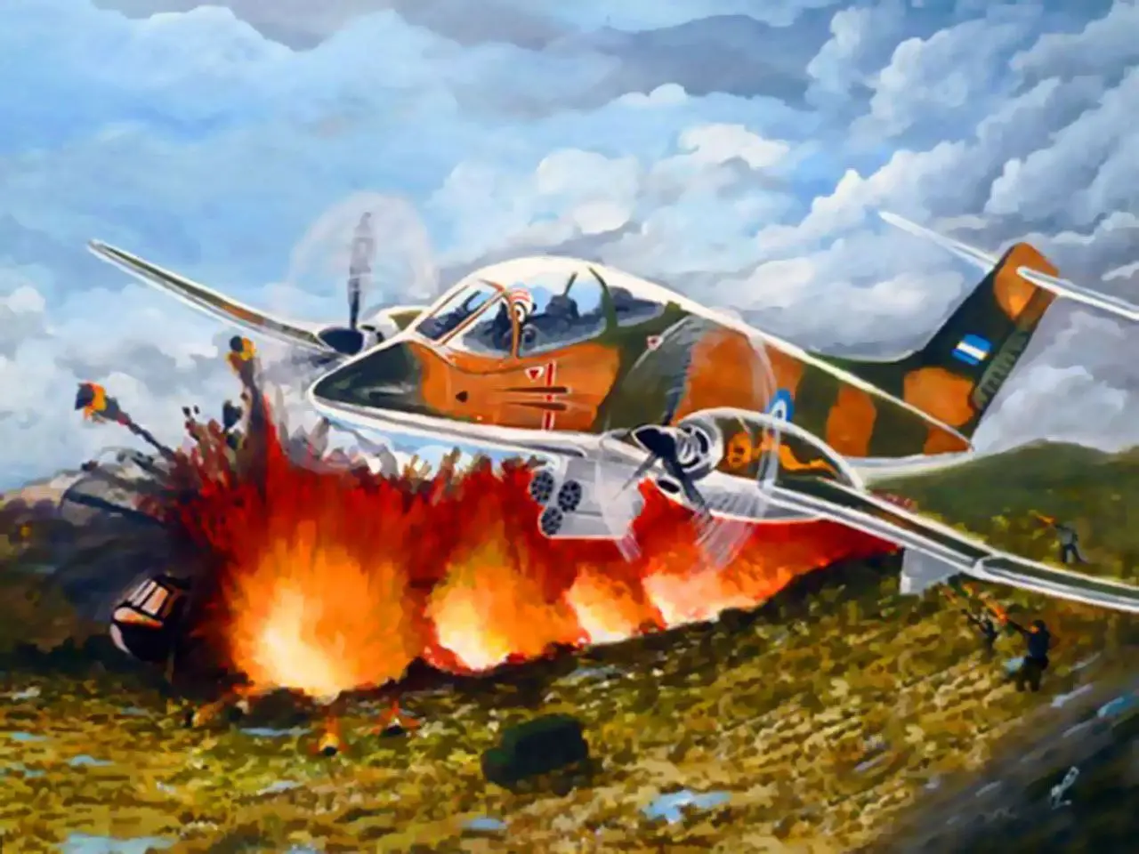 Примерно в то же время три «Пукара» капитана Бенитеса, майора Томба и первого лейтенанта Мишелу с авиабазы Гуз-Грин пытались атаковать ударную группу. У турбовинтовых самолётов, предназначенных для борьбы с повстанцами, шансов поразить корабли, прикрываемые истребителями «Си Харриер», не было. Капитан Бенитес был сбит из ПЗРК «Стингер», но катапультировался и добрался до базы пешком, майор Томба — истребителем капитана 3-го ранга Найджела «Шарки» Уорда, катапультировался и был выловлен из залива Сан-Карлос аргентинской пехотой, только первый лейтенант благополучно приземлился на аэродроме Пуэрто-Архентина.