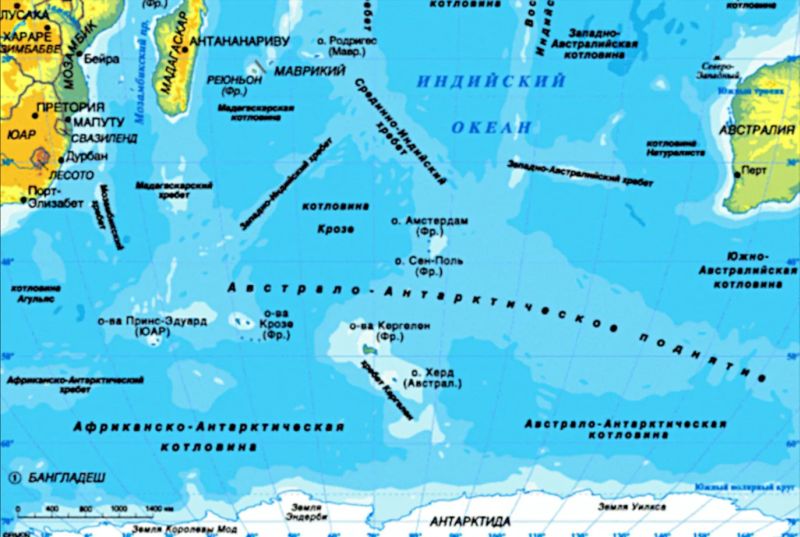 Более обширная экономическая зона Франции, не менее 770 тыс. кв. км, находится юго-восточнее тех районов, то есть на юге Индийского океана, где расположены французские о-ва Кергелен (7200 кв. км), Новый Амстердам, Сен-Поль и Круазо (между ЮАР и Австралией). Здесь также предварительно разведаны нефтегазовые ресурсы, хотя объёма, меньшего примерно в 2,5 раза в сравнении с упомянутым. Территориальный и ресурсный факторы повышают геополитическую и хозяйственную роль Франции с её колониальными осколками в обширном регионе, что иллюстрируется, к примеру, третьим местом Франции в мире (после КНР и Индонезии) по объемам имеющихся и осваиваемых рыбных ресурсов...