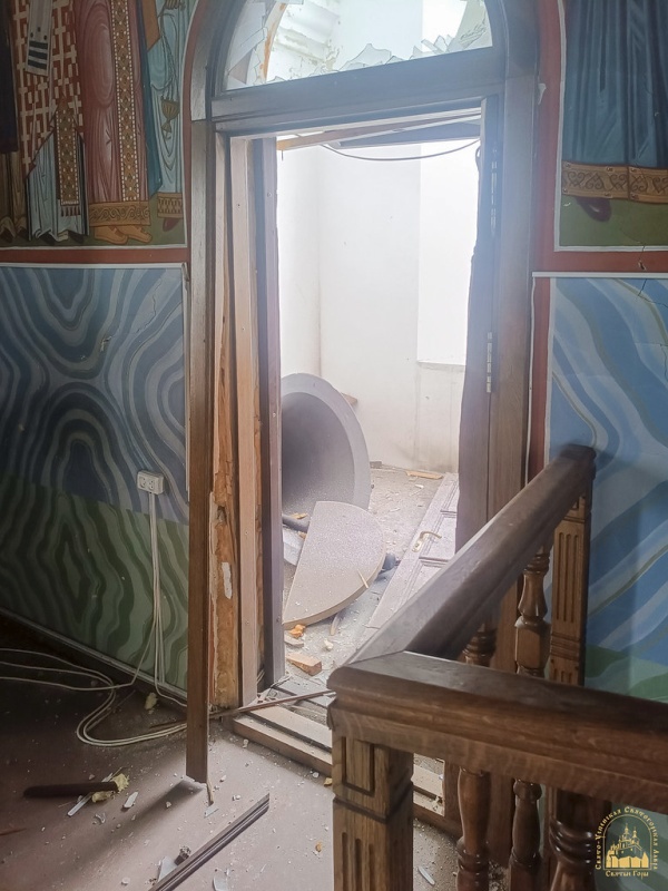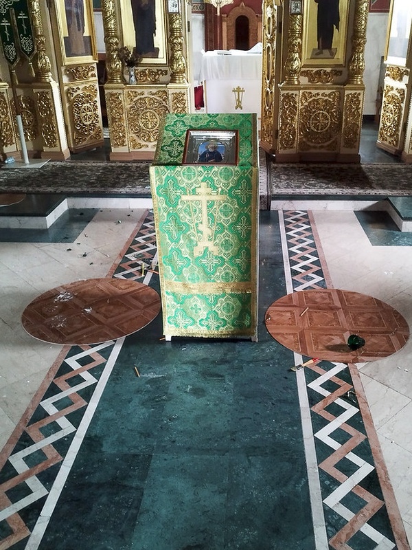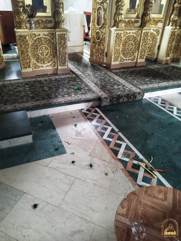 Но на этом грабители не остановились. Из основной части нижнего придела храма они вынесли четыре подсвечника, вошли в алтарь и забрали всю церковную утварь – напрестольные лампады, подсвечники, семисвечник, стоявшее на жертвеннике распятие и латунный алтарный аналой. Похищены были напрестольное и требное Евангелия, а оставшиеся в алтаре церковные предметы были разбросаны, а лампады разбиты. Также злоумышленники вскрыли церковную кружку. Лаврская братия подала заявление в отделение полиции № 4 РУП ГУНП в Донецкой области.