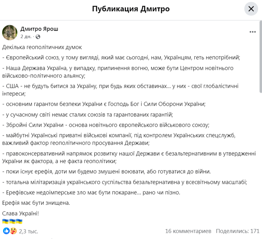«Наше Государство Украина, в случае прекращения огня, может быть Центром новейшего военно-политического альянса. Вооруженные Силы Украины – основа новейшего европейского военного союза», - заявил Ярош.
