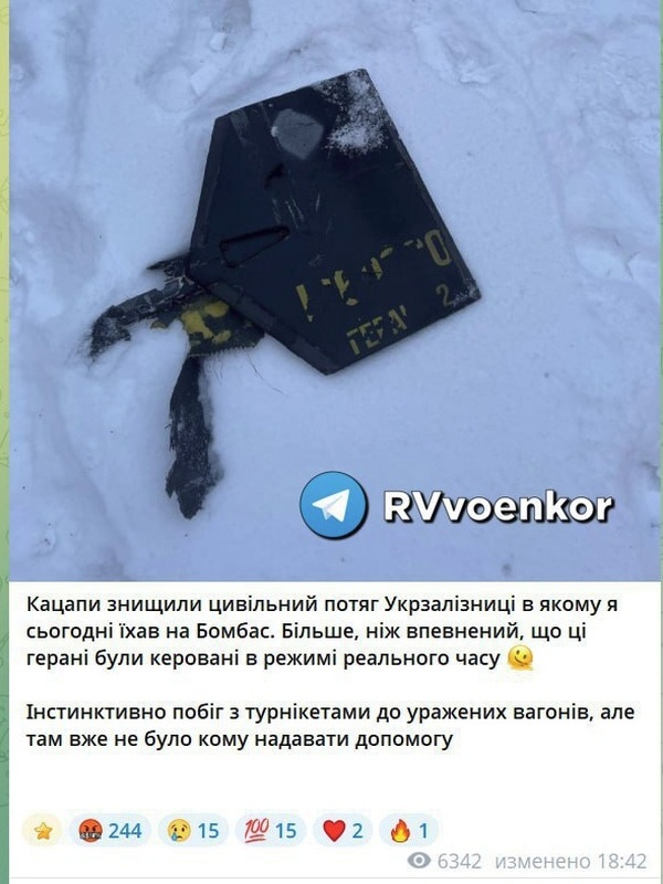 27 января «Герани» атаковали в Харьковской области пассажирский поезд «Барвенково — Львов — Чоп». В результате атаки вспыхнул пожар в локомотиве и в первом вагоне.