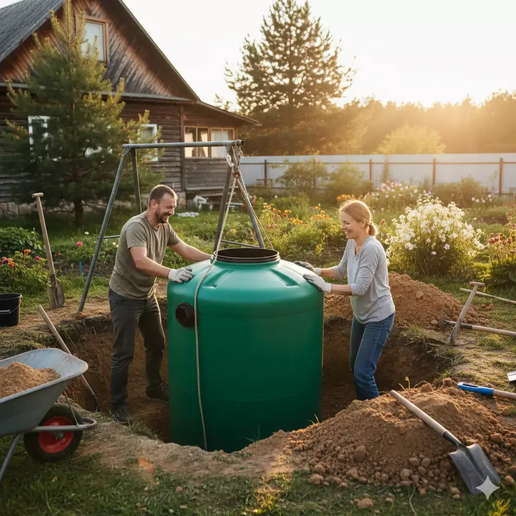 Шаг 3: Установка септика. Вот он, самый волнительный момент! Если септик небольшой, можно попробовать опустить его в котлован силами нескольких человек. Если же это массивная конструкция, то без спецтехники не обойтись. Очень важно установить септик строго горизонтально, используя строительный уровень. А чтобы его не выдавило грунтовыми водами (что, увы, бывает), некоторые прибегают к хитрости: заливают бетонную плиту на дно котлована и к ней крепят септик специальными стяжками.