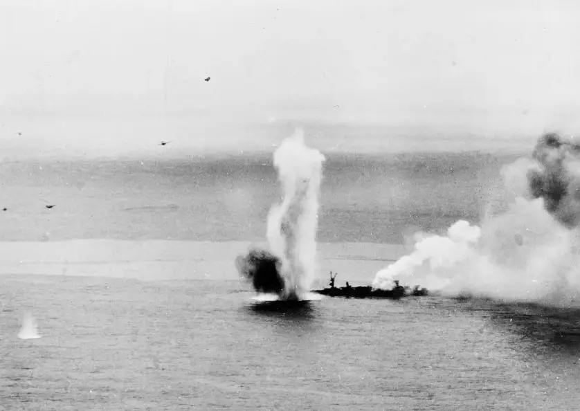 Первый взрыв в машинном отделении вместе с душами механиков выбрасывает облако пара высотой в несколько десятков метров, а второй, попавший в кормовой торпедный аппарат, разносит весь корабль. От взрыва торпед в аппарате детонирует кормовой артпогреб.