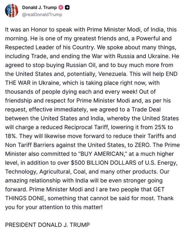 «С немедленным вступлением в силу мы договорились о торговой сделке между Соединенными Штатами и Индией, при которой Соединенные Штаты будут взимать сниженную взаимную пошлину, уменьшив ее с 25% до 18%. Они аналогично продвинутся в снижении своих пошлин и нетарифных барьеров в отношении Соединенных Штатов до нуля. Премьер-министр также обязался «купить американское» на гораздо более высоком уровне, в дополнение к более чем 500 миллиардам долларов американской энергии, технологий, сельскохозяйственной продукции, угля и многих других продуктов. Наши удивительные отношения с Индией станут еще крепче в будущем. Премьер-министр Моди и я — два человека, которые выполняют дела, чего нельзя сказать о большинстве», — резюмировал Дональд Трамп.