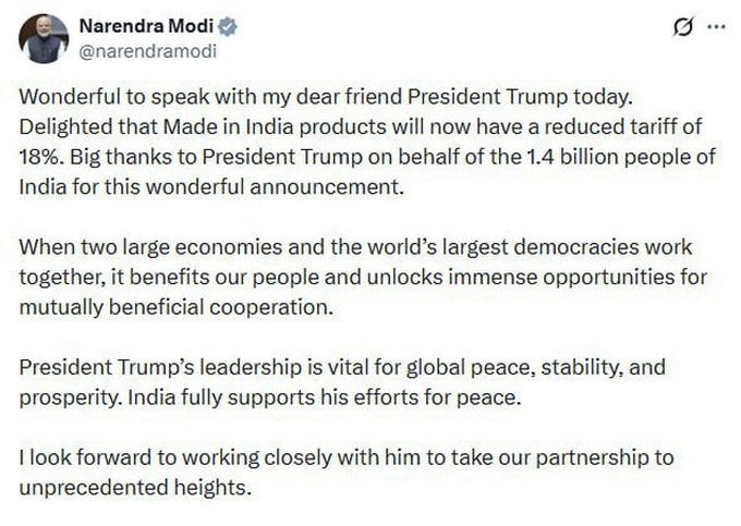 «Было замечательно поговорить с моим дорогим другом, президентом Трампом. Я рад, что на товары, произведенные в Индии, теперь будет действовать сниженная таможенная пошлина в размере 18%. Огромное спасибо президенту Трампу от имени 1,4 миллиарда жителей Индии за это замечательное объявление», — написал Моди в соцсети Х.