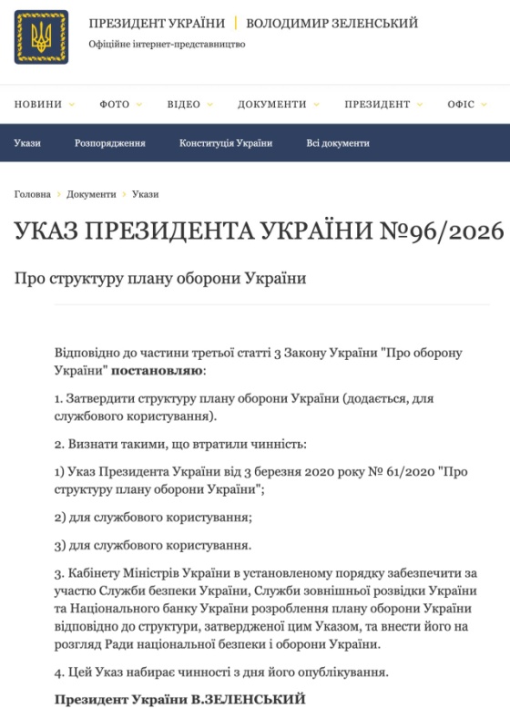Владимир Зеленский обновил план обороны Украины, который был утверждён ещё до войны и действовал шесть лет. На сайте президента Украины опубликован указ №96/2026 о том, что предыдущий план 2020 года признаётся недействительным.
