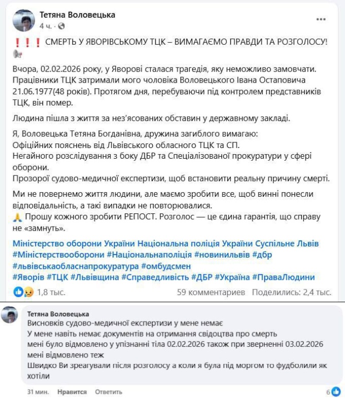Об этом сообщила жена погибшего Воловецкая Татьяна в соцсетях. По ее словам, 02.02.2026 года в Яворове Львовской области работники ТЦК силой задержали ее мужа Воловецкого Ивана Остаповича 21.06.1977 г.р. и доставили его в военкомат, где он скоропостижно скончался. Обстоятельства смерти остались тайной.
