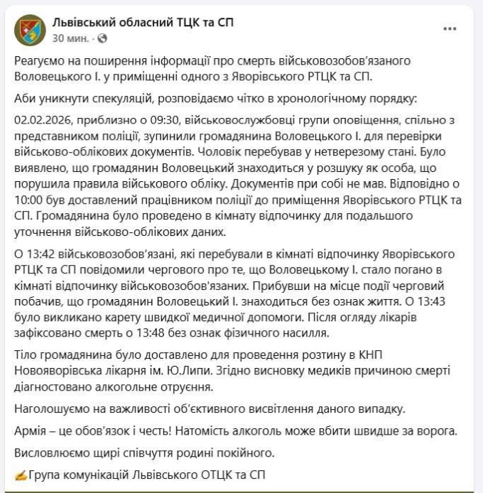 Пресс-служба Львовского областного ТЦК поспешила выступить с опровержением. Ответ ТЦК звучит строго по методичке. Мужчина находился в состоянии алкогольного опьянения, был в розыске за нарушение воинского учёта, а в помещении военкомата ему «стало плохо». Медики, по версии ведомства, не нашли следов насилия, а вскрытие показало отравление алкоголем. Формулировка привычная, удобная и, как правило, закрывающая любые неудобные вопросы.