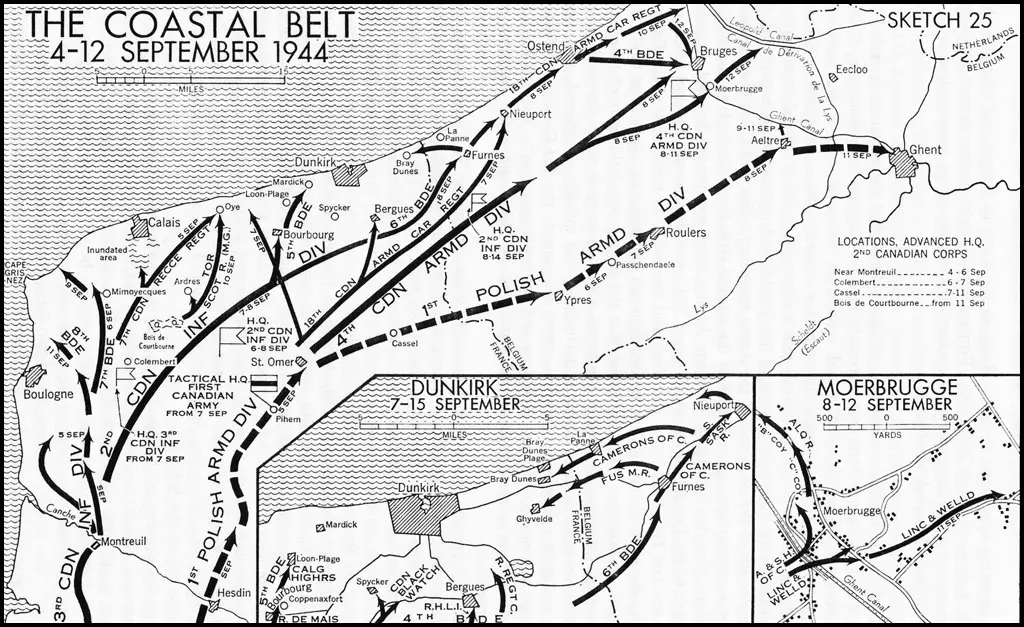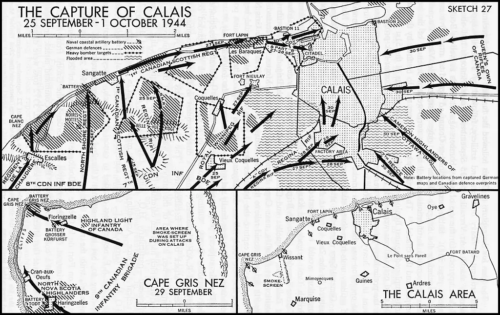 На этот раз союзники совершили «благородный акт» — по просьбе немецкой стороны позволили мирным жителям Булони и Кале покинуть места боев. Кроме сотен бомбардировщиков наступление канадцев поддерживала дальнобойная береговая артиллерия с английского побережья. К 30 сентября в руках союзников оказался участок побережья от Шербура до Кале, в плен попало около 30 тысяч немцев, потери их противников составили около 1500 человек. Но порты были надолго выведены из строя.