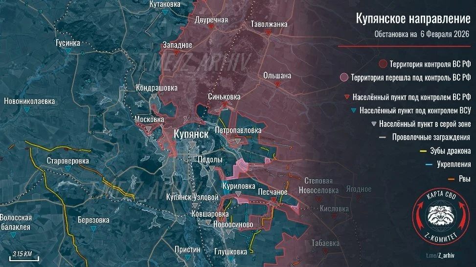 По состоянию на 07.02.2026 конфигурация фронта претерпела ряд тактических изменений, которые в совокупности создают серьезную угрозу для украинской группировки на левом берегу Оскола.
