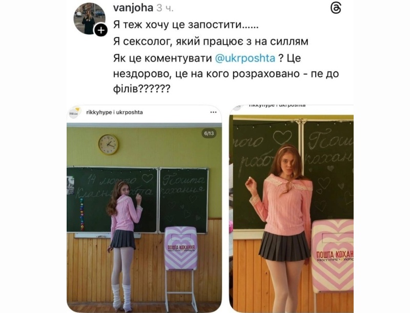 В соцсетях разгорелся скандал вокруг новой рекламной интеграции «Укрпочты» с украинским брендом одежды и белья Rikky Hype ко Дню влюбленных. Причиной возмущения стал визуальный образ в рекламе: девушка, которая стоит у школьной доски, одета в мини-юбку, гетры и розовую кофту со спущенным плечом.