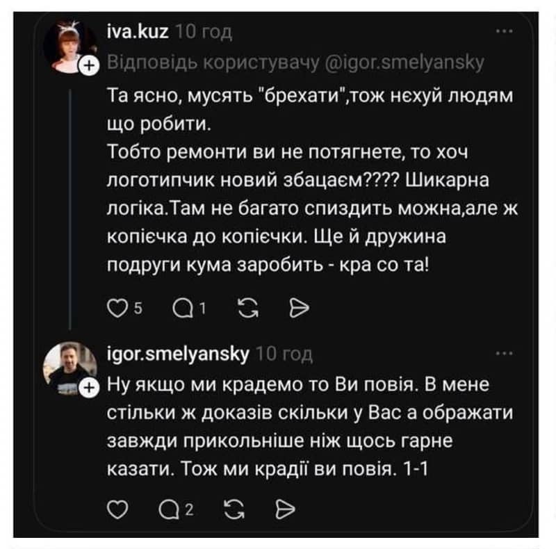 Генеральный директор АТ «Укрпочта» Игорь Смелянский резко ответил на критику решения об изменении логотипа. Он назвал «шлюхой» украинку за то, что написала, что за потраченные средства лучше было бы отремонтировать хотя бы одно из отделений почты. На возмущение пользователей он написал, что ответил не женщине — а «какой-то твари», пола которой он не заметил.