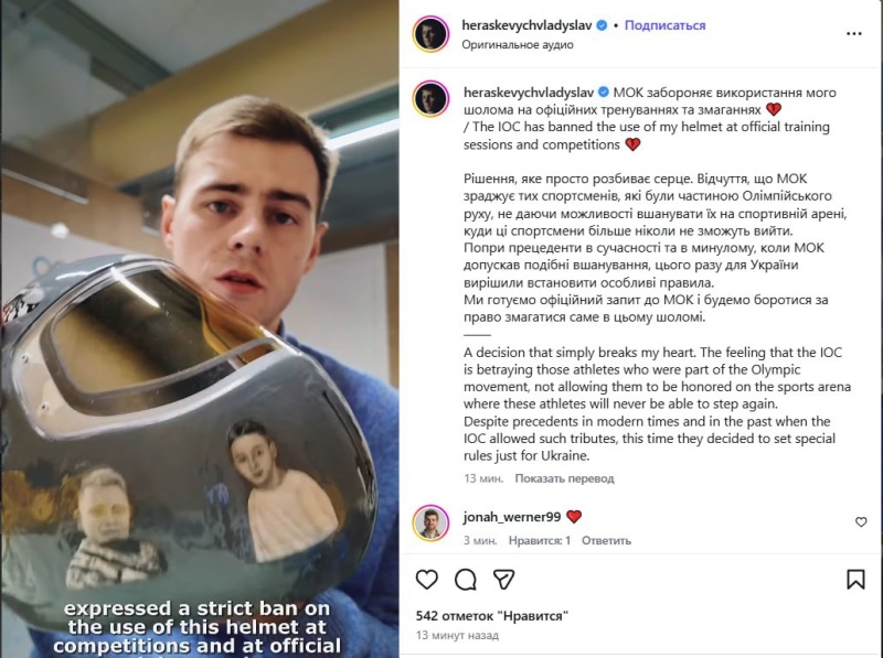 Организаторы Олимпийских игр запретили украинскому скелетонисту Владиславу Гераскевичу выступать в шлеме с изображениями погибших на фронте украинских спортсменов. Решение объяснили требованиями нейтралитета и запретом на любые политические и мемориальные символы во время соревнований. Спортсмену предложили заменить экипировку, чтобы он мог быть допущен к старту.