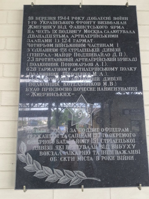 Память о подвиге героев Великой отечественный войны стирают и в Жмеринке Винницкой области. Местные власти демонтировали мемориальную доску на вокзале, установленную в честь освобождения города от немецких захватчиков 18 марта 1944 года. Теперь, как выяснилось, для чиновников это событие «не имеет значения».