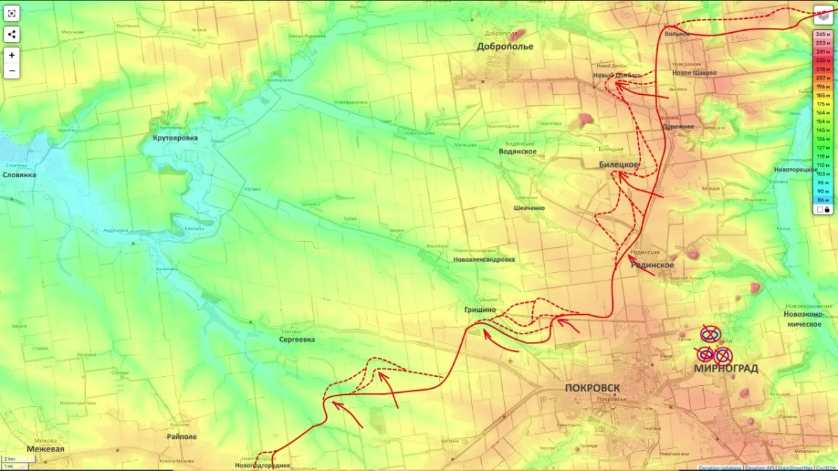 - Добропольское направление: Здесь фиксируются наиболее заметные успехи. Согласно данным мониторинговых каналов противника, ВС РФ имеют глубокие вклинивания в оборону ВСУ в районе Белицкого (севернее и южнее поселка), а также успехи у Нового Донбасса и Гришино. Украинские источники характеризуют ситуацию под Белицким как «чрезвычайно тяжелую».