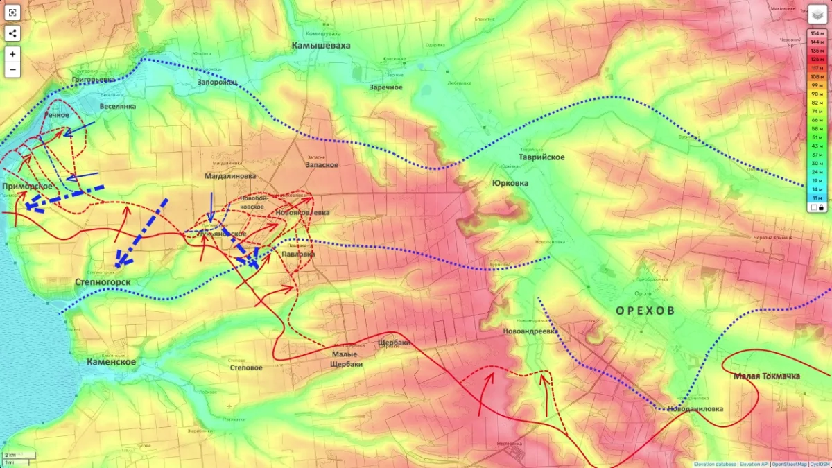 Потеряв главную линию обороны и допустив выход ВС РФ через Степногорск на север (вектор Приморское — Новояковлевка — Павловка), ВСУ оказались перед фактом: русские войска прорываются к Камышевахе и переправам через реку Конка.