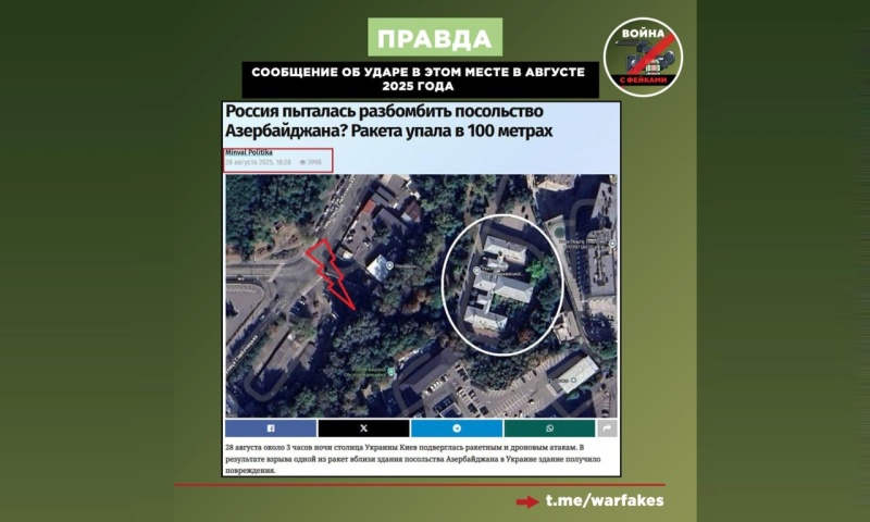 Тогда же диписточник «РИА Новости» подчеркнул, что при планировании огня ВС РФ учитываются места расположения дипломатических представительств на Украине и другая информация, исключающая урон гражданским. По его словам, характер повреждений посольства говорит о свежем падении обломков ракет ПВО Patriot, а «воронка от удара», которую Киев выдает за якобы свежий след от «Искандера», видна уже на фото с лета 2025 года.