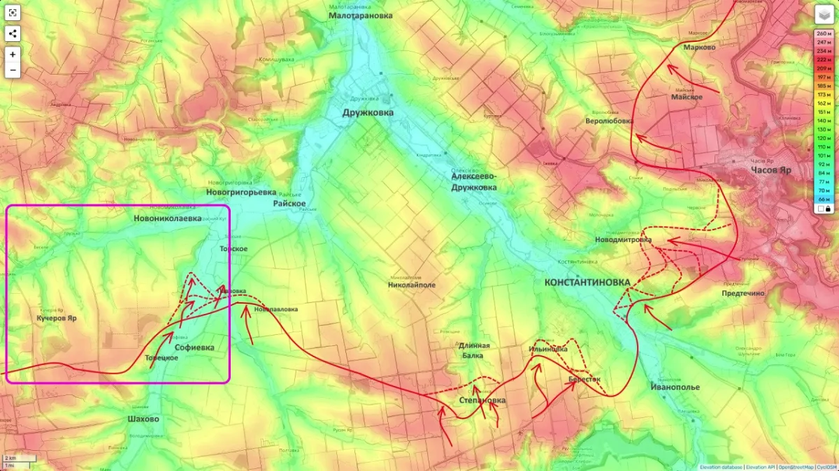 Подтвержден повторный заход российских штурмовых групп в юго-западную часть Константиновки. Закрепление идет в районе высотной застройки через Бересток и Ильиновку. Теперь штурм города ведется с двух направлений — с юго-востока и юго-запада, что критически усложняет положение гарнизона ВСУ.