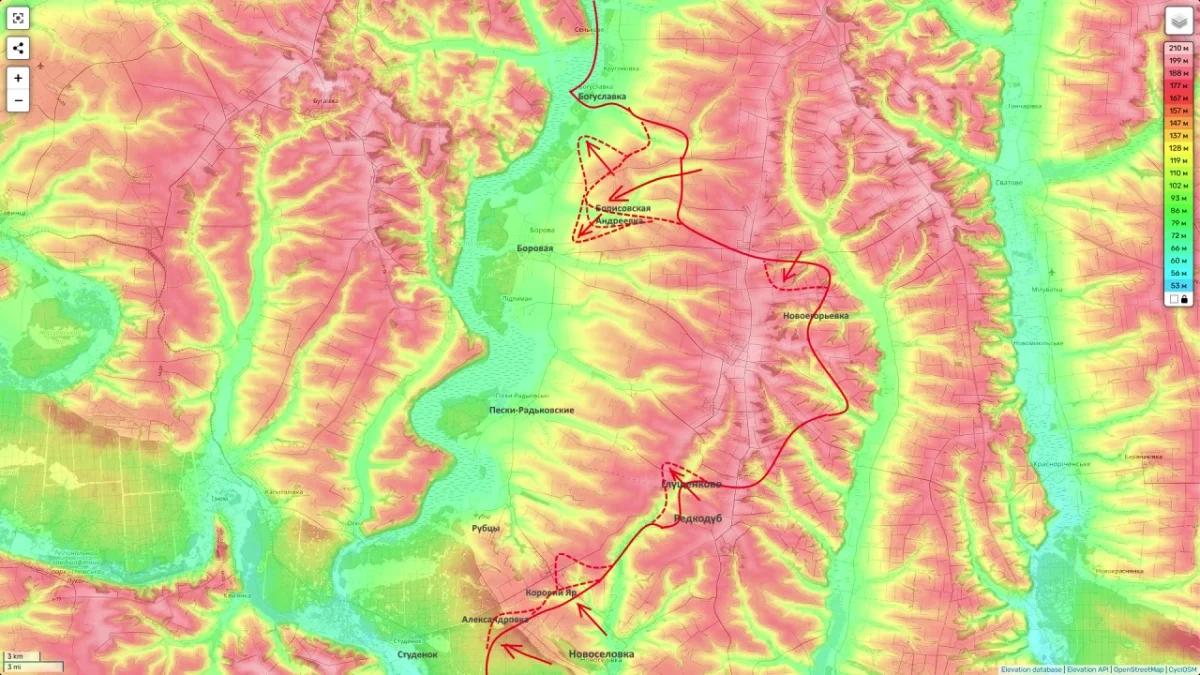 Наблюдается продвижение в сторону Рубцов и Коровьего Яра. Эксперты связывают эти маневры с планомерной операцией по выходу к реке Оскол — важнейшей водной преграде, определяющей логистику и архитектуру обороны на данном участке.
