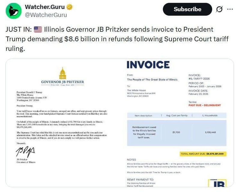 Губернатор Иллинойса, демократ Джей Роберт Притцкер потребовал от Трампа 8,679 млрд долларов в счет погашения ущерба фермерам, пострадавшим от торговых пошлин, и гражданам, пострадавшим от роста цен.