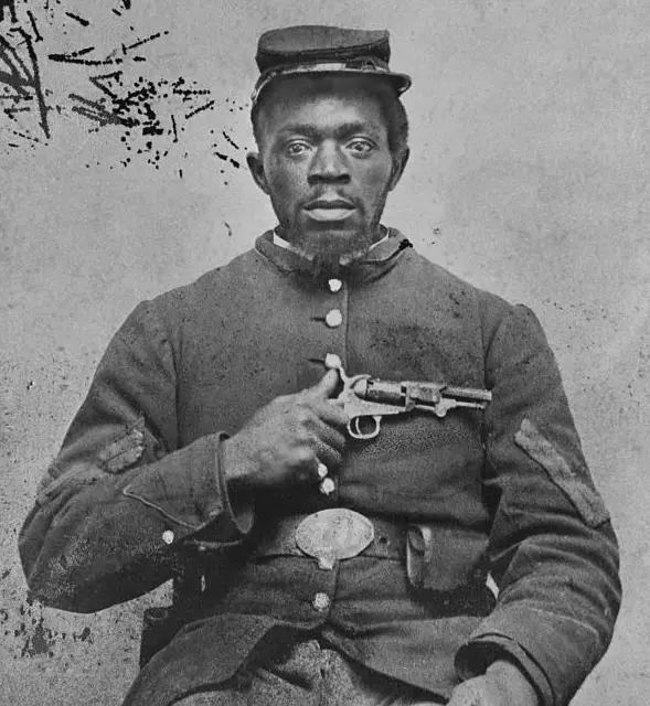 А дальше была Гражданская война. Хотя Кольт уже не был монополистом по условиям патента, его завод просто утонул в заказах. И дело не только в поставках в армию, солдаты при первой возможности пытались обзавестись револьвером. На фото черный капрал армии Союза с карманным кольтом образца 1849 года. Да, в то время было не принято улыбаться на фото. Дело серьёзное и дорогое, а вы зубы показываете.