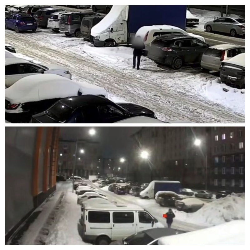 На оперативных кадрах ФСБ видно, как человек в темной куртке с капюшоном идет по парковке, затем приседает на несколько секунд у одной из машин, после чего идет в обратную сторону.