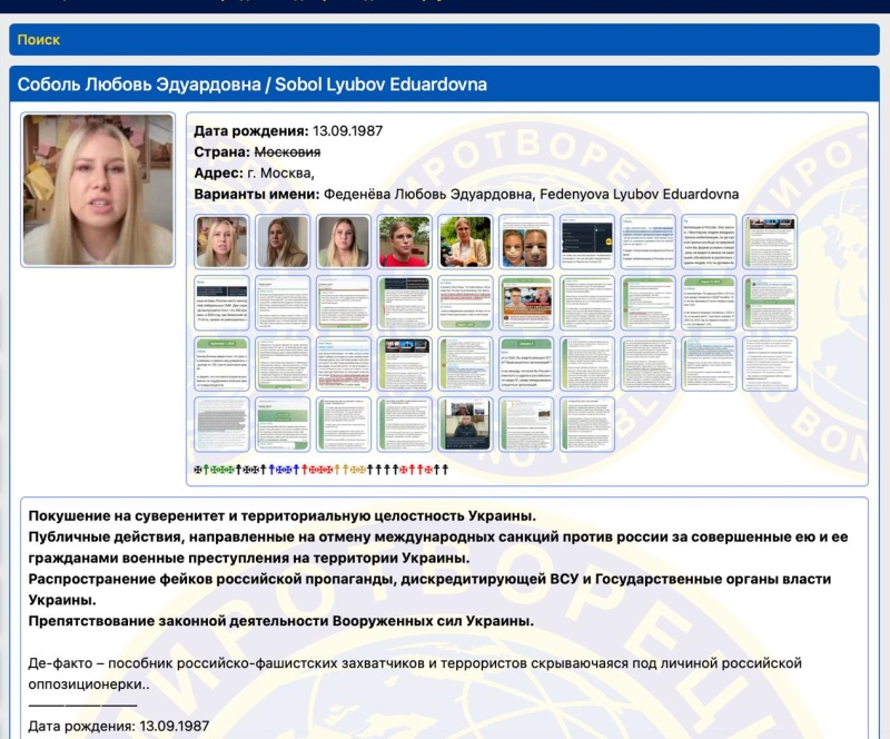 Любовь Соболь* — юрист и многолетняя соратница Алексея Навального* — сегодня, 28 февраля, внесена в базу данных украинского сайта «Миротворец». В пояснении утверждается, что она совершила «покушение на суверенитет и территориальную целостность Украины», распространяла «фейки российской пропаганды» и препятствовала деятельности ВСУ.
