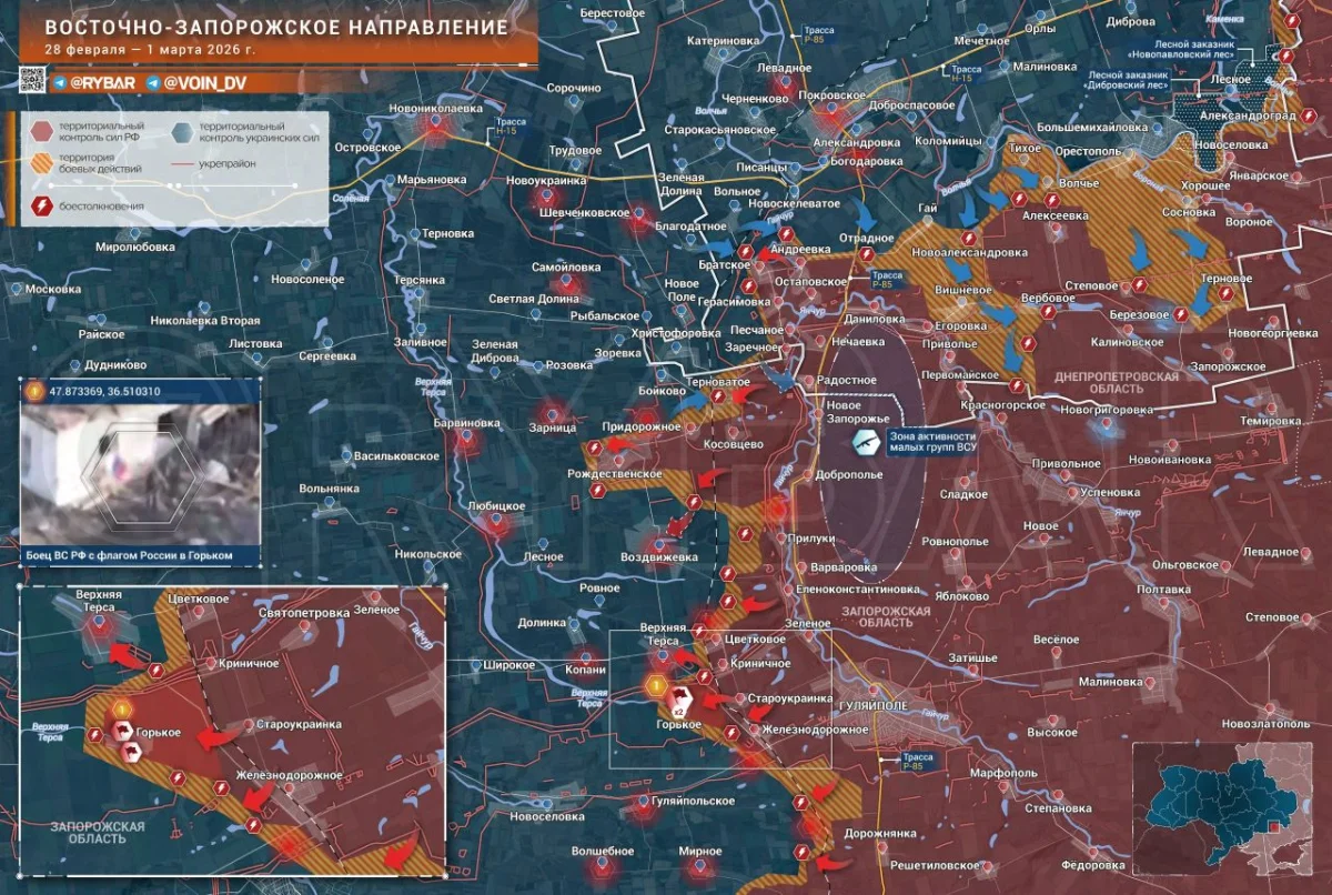 На Гуляйпольском направлении фиксируется уверенное продвижение ВС РФ со стороны Горького к крупному опорному пункту южнее Верхней Терсы, а также со стороны Цветкового. Взятие этого района стабилизирует фронт и перекроет кислород украинским ДРГ, действовавшим у Прилук и Еленоконстантиновки.