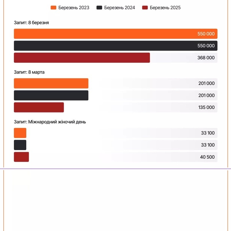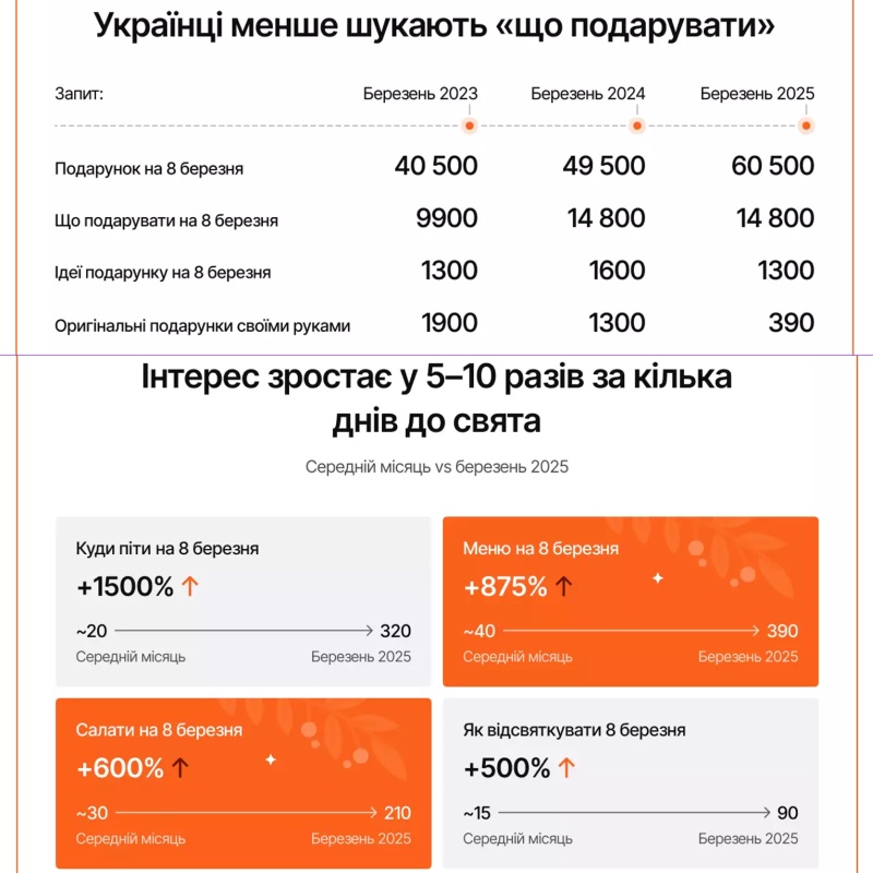 Интерес к сюрпризам на праздник остается относительно стабильным. Цветы, открытки, сладости — традиционные атрибуты женского праздника. Так, цветы перед 8 марта ищут в 6−7 раз чаще, чем в остальной части года. Интерес к сладким подаркам возрастает в 10,5−11 раз. Подарочные наборы (с косметикой, парфюмерией) ищут в 19−21 раза чаще, чем в непраздничный период. При этом, украинцы больше сосредоточены на пользе или эмоциях, а не на цене подарков.