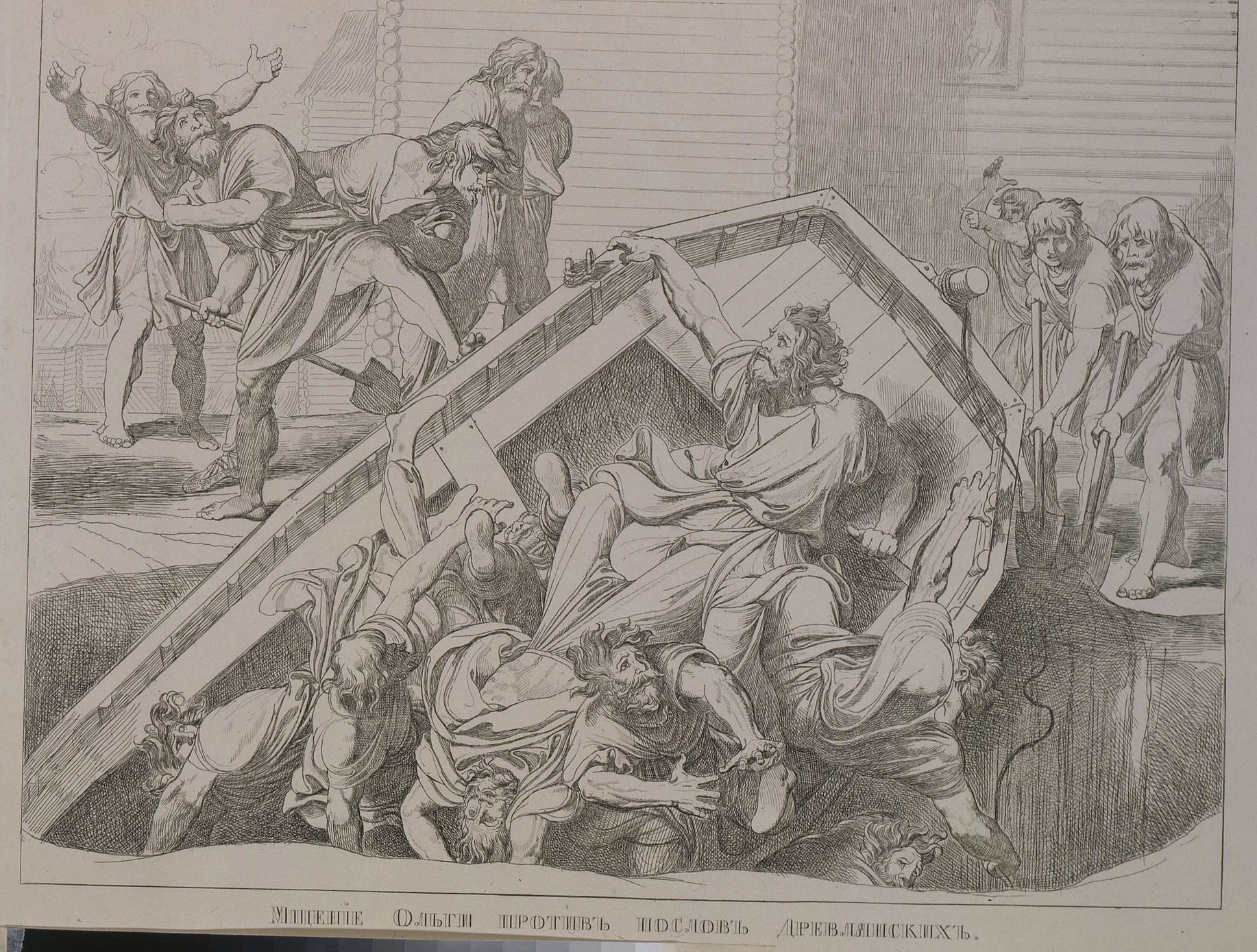 Первое древлянское посольство из 20 человек прибыло в ладье. Ольга притворно согласилась на брак и велела оказать послам высокую честь — нести их ладью на руках. Довольные древляне гордо восседали в лодке, не подозревая, что их несут к огромной яме. По приказу княгини послов вместе с ладьей сбросили в яму и закопали живьём.