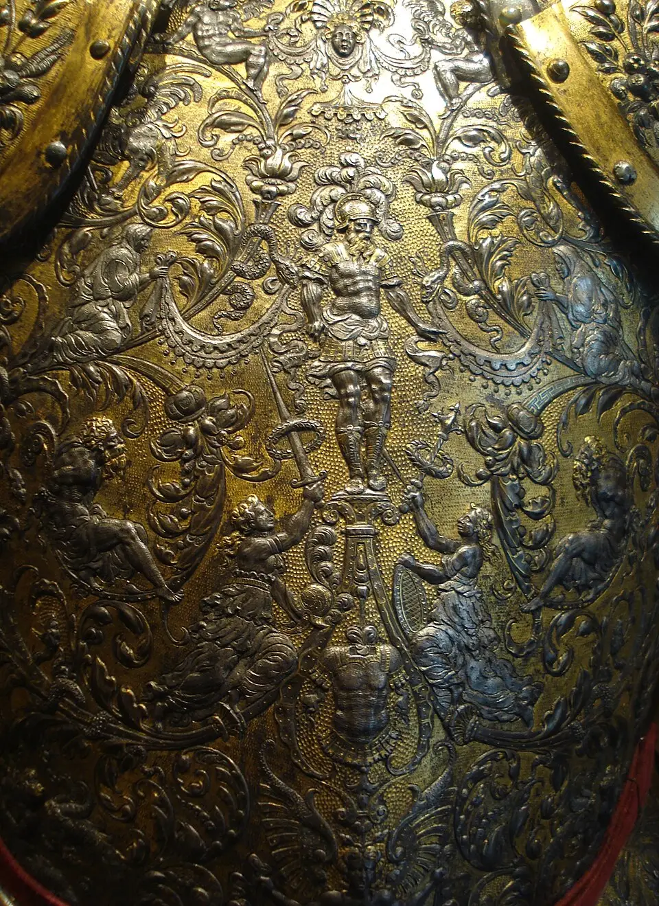 Понятно, что это не боевой, а парадный доспех, которые, предположительно, датируются 1553–1555 годами. И роскошь его неудивительна, поскольку авторство приписывается известному французскому ювелиру и граверу Этьену Делону. Доспех, предназначенный для торжественных церемоний, был изготовлен из стали, золота и серебра, а также украшен тисненой кожей и красным бархатом. Ну а многочисленные фигуры, выгравированные на поверхности этого доспеха, на его нагруднике и на спине, символизируют его военные успехи.