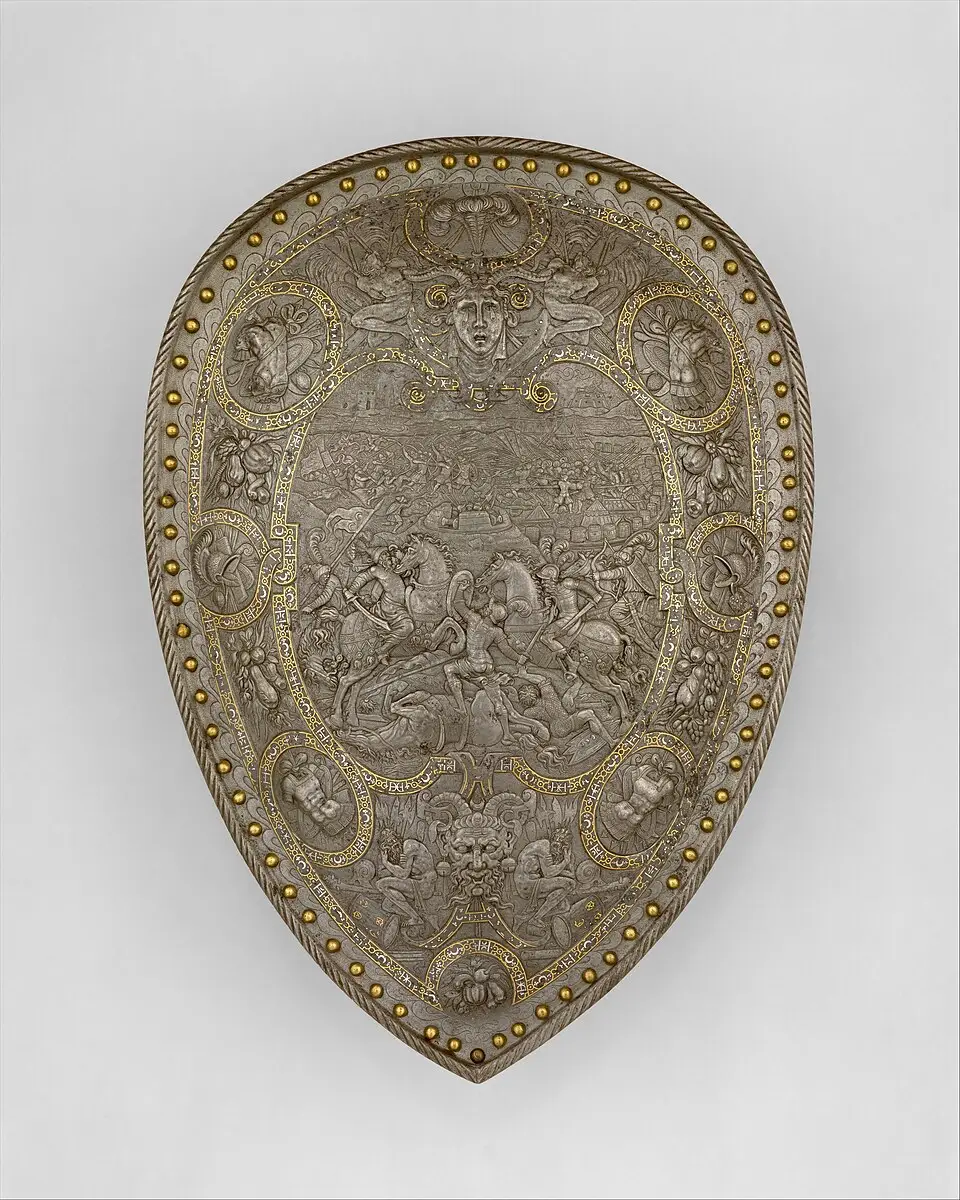 Хотя щиты в это время рыцарям уже не требовались, их все равно делали «красоты ради» в комплект к парадным доспехам. Один из таких щитов Генриха II на котором изображена сцена сражения европейских всадников в античных доспехах с турками есть и в коллекции Метрополитен-музея в Нью-Йорке