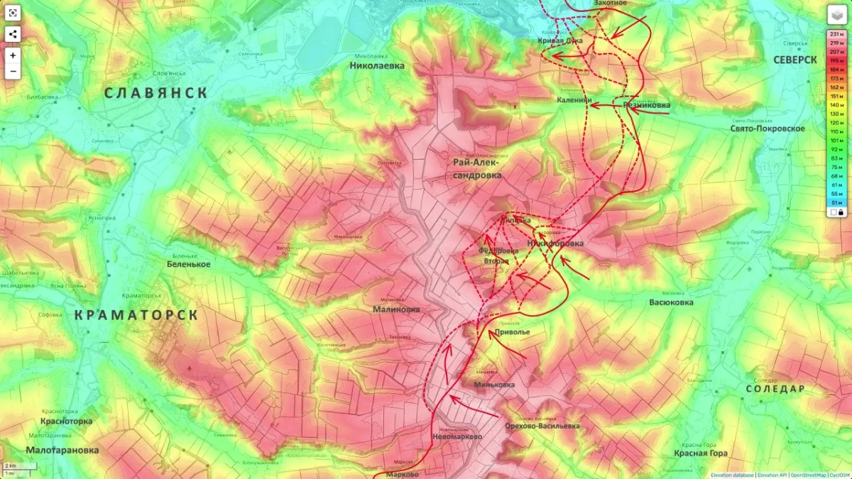 Кроме того, по словам обозревателя, российские силы продвигаются вдоль канала Северский Донец — Донбасс, пытаясь толкать фронт к Малиновке. В его интерпретации это движение имеет не локальный, а оперативный смысл: выход через данный рубеж способен приблизить начало полномасштабного сражения за Славянск и Краматорск.