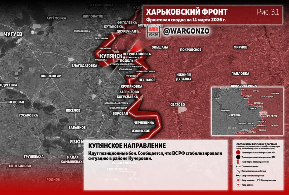 Оперативная обстановка: позиционные бои и тактическая чересполосица, карта боевых действий на Купянском направлении на 11.03.2026