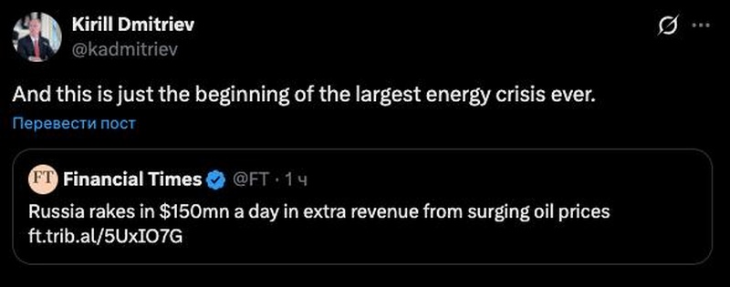 «И это только начало крупнейшего энергетического кризиса в истории», — прокомментировал публикацию издания Дмитриев.