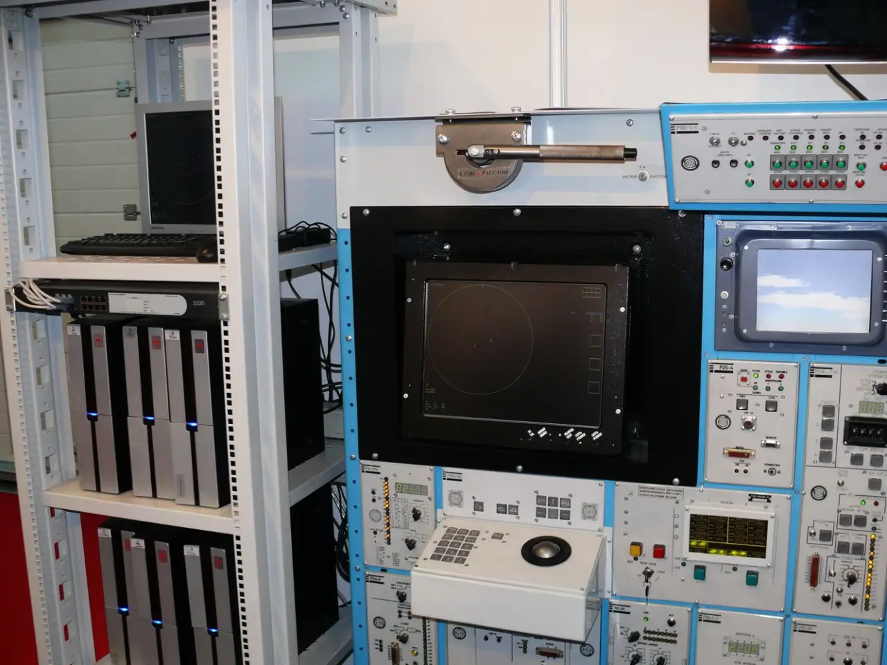 Что из себя представлял этот блок? В кабине управления между индикатором дальности оператора дальности и индикатором ИКО оператора угловых координат «вставили» 16-сантиметровый (по диагонали) чёрно-белый кинескоп с высоким качеством изображения. Под ИКО находятся две ручки (маховика) ручного управления — левая по углу места, правая по азимуту, на современных комплексах С-300В и «Бук» маховики заменены на один кнюппель (шаровой манипулятор, виден в нижней части фото 5), не уверен, что это удачное решение, лично мне удобнее были маховики, но кто на что учился, дело привычки.
