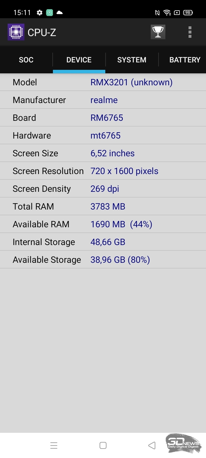 В realme C21 установлен ЖК-экран с IPS-матрицей диагональю 6,5 дюйма с разрешением 1600 × 720 точек, что позволяет рассчитывать на плотность 270 ppi — показатель средний, некоторая пикселизация на шрифтах будет заметна.