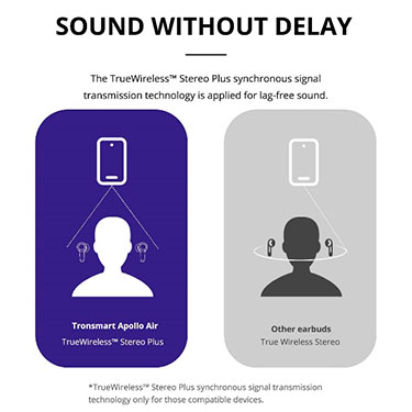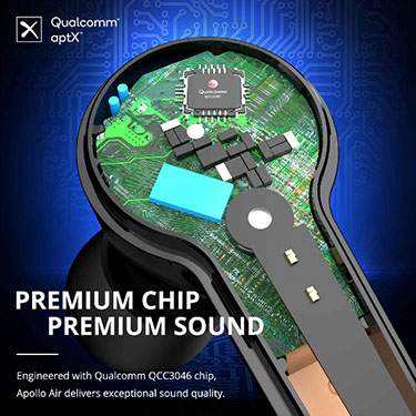Флагманский чип Qualcomm QCC3046 с поддержкой Bluetooth 5.2 и технология aptX Adaptive обеспечивает меньшую задержку, в то время как поддержка передовой технологии синхронной передачи TWS+ выгодно выделяет новинки среди большинства моделей на рынке. У конкурирующих продуктов сигнал от мобильного телефона сначала идёт на основной наушник, а затем передаётся на другой, что ведёт к задержке звука. С TWS + оба наушника получают сигнал от телефона одновременно, поэтому между ними отсутствует задержка. Более того технологии Qualcomm aptX и aptX Adaptive для Apollo Air + обеспечивают непрерывный звук высокого разрешения Hi-Res.